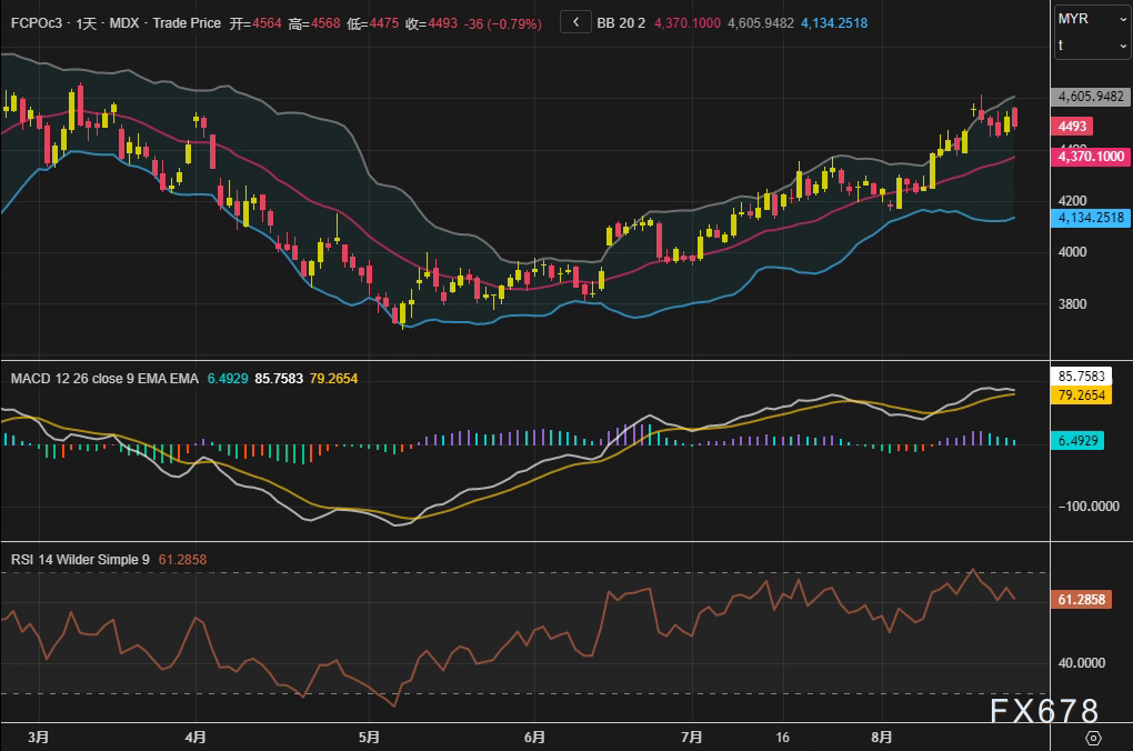 从技术指标看,当前棕榈油合约处于多空博弈的关键位置。布林带(20,2)中轨位于4370林吉特,上轨触及4606林吉特,下轨支撑位于4134林吉特。MACD(12,26,9)虽保持金叉状态,但快慢线差值收窄至6.49,红柱收缩暗示动能减弱。RSI(14)读数61.29,暂未进入超买区间,但已脱离强势区域。   日内价格回调主要源于获利了结与需求端疑虑。吉隆坡交易公司Iceberg X Sdn Bhd的自营交易员David Ng指出:“棕榈油近期涨幅可能抑制未来需求,且豆油与棕榈油价差收窄削弱了后者的竞争优势。”他同时提示,短期支撑位看4450林吉特,阻力位关注4600林吉特。   出口数据分化   船运调查机构数据显示,8月1日至25日马来西亚棕榈油产品出口量环比增长10.9%至16.4%。尽管增幅显著,但市场对后续订单持续性存疑。高价环境下,印度和中国采购节奏可能放缓,尤其与南美豆油出口竞争加剧。   生物柴油需求支撑   原油价格走强为棕榈油生物燃料需求提供托底作用。近期地缘政治事件推升油价,市场担忧俄罗斯供应受美国制裁及乌克兰袭击能源基础设施影响。棕榈油作为生物柴油原料的替代吸引力随之提升。   汇率与政策扰动   林吉特兑美元汇率当日升值0.47%,令以美元计价的棕榈油采购成本增加,间接压制进口国需求。另一方面,印尼针对欧盟生物柴油反补贴税的WTO胜诉可能中长期利好全球棕榈油贸易格局,但短期实际影响有限。   Iceberg X Sdn Bhd交易员David Ng   明确表示:“豆油与棕榈油价差收窄正削弱棕榈油的性价比优势。”其认为当前市场需突破4600林吉特阻力才能打开上行空间,否则可能回探4450林吉特支撑。   知名机构调查数据显示   8月出口增长虽乐观,但部分分析师提示需关注9月后到港量是否匹配实际消费。此外,中国国内油脂库存变化及南美新季大豆播种进度将成为未来跨品种价差的关键变量。   尽管棕榈油短期面临需求端压力,但生物柴油政策与原油价格联动仍提供底部支撑。若后续出口数据持续强劲或豆油价格再度走强,棕榈油有望重拾升势。然而,若林吉特维持强势或全球植物油供应超预期增加,价格调整周期可能延长。   市场需密切关注9月初的MPOB月度报告及印尼出口税费政策调整。中长期看,供需平衡表的修复仍需消费端实际增长验证,而非仅靠预期驱动。